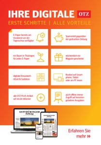 Hier kommt Ihre digitale Vorteilswelt! Schöpfen Sie Ihre OTZ Digital voll aus: Aktualität Lesen Sie heute schon, was morgen zählt: Ihr E-Paper steht Ihnen bereits am Vorabend vor der Tagesschau zur Verfügung! Das bedeutet nicht, dass Ihre digitale Tageszeitung dann bereits abgeschlossen ist: Wir recherchieren auch danach noch weiter für Sie und aktualisieren die Erstveröffentlichung, sodass Sie selbstverständlich auch über spätabendliche Sportereignisse oder Stadtratssitzungen informiert sind. Sparvorteil Gegenüber einem Abo der gedruckten Zeitung sparen Sie mit einem Digital-Abo jährlich mehr als 190 Euro. So genießen Sie 100 % Inhalte zum Sparpreis, da wir die geringeren Aufwände für Produktion und Zustellung gern an Sie weitergeben. Mehr lesen – mehr Extras In der E-Paper-App haben Sie jetzt Zugriff auf exklusive Podcasts Ihrer Redaktion sowie auf die Prospekte und Extras, die der gedruckten Zeitung beiliegen. Als besonderes Dankeschön finden Sie in den Beilagen der E-Paper-App wöchentlich das Digitale Extra. Das Gratis-Magazin aus unserem abwechslungsreichen Verlagssortiment beschert Ihnen noch mehr digitales Lesevergnügen – z.B. mit Hörzu Wissen oder LandIDEE. Ein Baum für jedes E-Paper Dafür steht „Wir forsten auf“, ein Projekt mit der Schutzgemeinschaft Deutscher Wald Thüringen e.V. für jedes neue E-Paper-Abo und jede Registrierung pflanzen wir einen Baum in Thüringen. Mehr unter www.otz.de/aufforsten. Digitaler Rätselspaß Das tägliche Kreuzworträtsel ist für viele zum liebgewonnenen Zeitvertreib geworden. Darauf müssen Sie auch in der digitalen Ausgabe nicht verzichten. Ohne Stift und Papier lassen sich Sudokus und Co. direkt im E-Paper ausfüllen. Zusätzlich bieten wir Ihnen jeden Samstag eine Rätselbeilage zum Knobeln. Ein Zugang für all Ihre Endgeräte Mit dem E-Paper holen Sie sich die Ausgabe Ihrer OTZ von Montag bis Sonntag direkt auf den Bildschirm – egal, wo Sie gerade sind. Lesen Sie die Nachrichten des Tages, fundierte Hintergrundberichte, Reportagen und Analysen – und das bequem auf Ihrem PC, Tablet oder Smartphone. Sie haben Ihr mobiles Endgerät nicht dabei? Einfach auf www.otz.de/epaper anmelden und schon können Sie Ihr E-Paper auf jedem beliebigen Computer oder Laptop auch ohne App aufrufen. Als Nutzer eines Smartphones oder Tablets können Sie die digitale Ausgabe Ihrer OTZ über unsere E-Paper-App herunterladen, sich mit den Zugangsdaten aus Ihrem Benutzerkonto anmelden und bequem loslesen. OTZ PLUS inklusive OTZ PLUS – das sind die PLUS-Inhalte auf www.otz.de. Exklusiv recherchiert, jederzeit aktuell und lesbar auf jedem Endgerät: Im Browser auf Ihrem PC oder Tablet. Oder auf Ihrem Smartphone in der OTZ News-App. Mobilität Mit Ihrem E-Paper sind Sie immer und überall bestens informiert. Laden Sie sich ganz einfach die Ausgabe herunter und greifen Sie überall darauf zu. Alle heruntergeladenen Ausgaben können jederzeit ohne Internetverbindung gelesen werden. Während die Ausgabe im Hintergrund geladen wird, können Sie bereits loslesen. Lesekomfort Lesen Sie alle Artikel klar und deutlich erkennbar in Ihrer bevorzugten Schriftgröße. In der Artikelansicht ändern Sie bequem den Schriftgrad für noch mehr Lesekomfort.